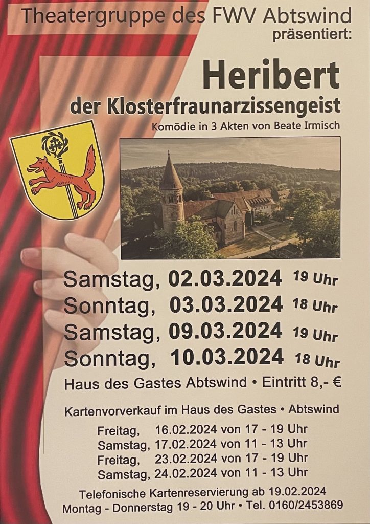 Zudem können Eintrittskarten ab dem 19.02.2024 von Montag bis Donnerstag zwischen 19:00 und 20:00 Uhr unter der Telefon-Nummer: 0160/ 24 53 869 verbindlich reserviert werden Wir freuen uns auf Ihren Besuch. Die Theatergruppe des Feuerwehr-Verein Markt Abtswind e.V.
